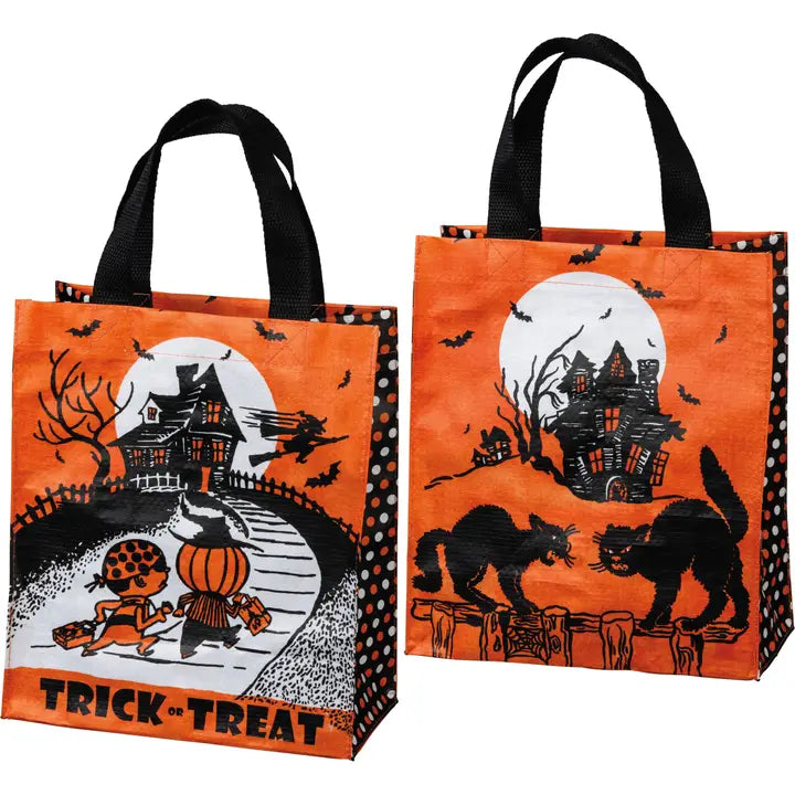 A vintage-inspired daily tote bag from our Halloween Collection featuring "Trick Or Treat" sentiment with costume characters, haunted houses, witch, black cat, bat, and moon design. Our Trick or Treat tote bag contains dual nylon hand straps.